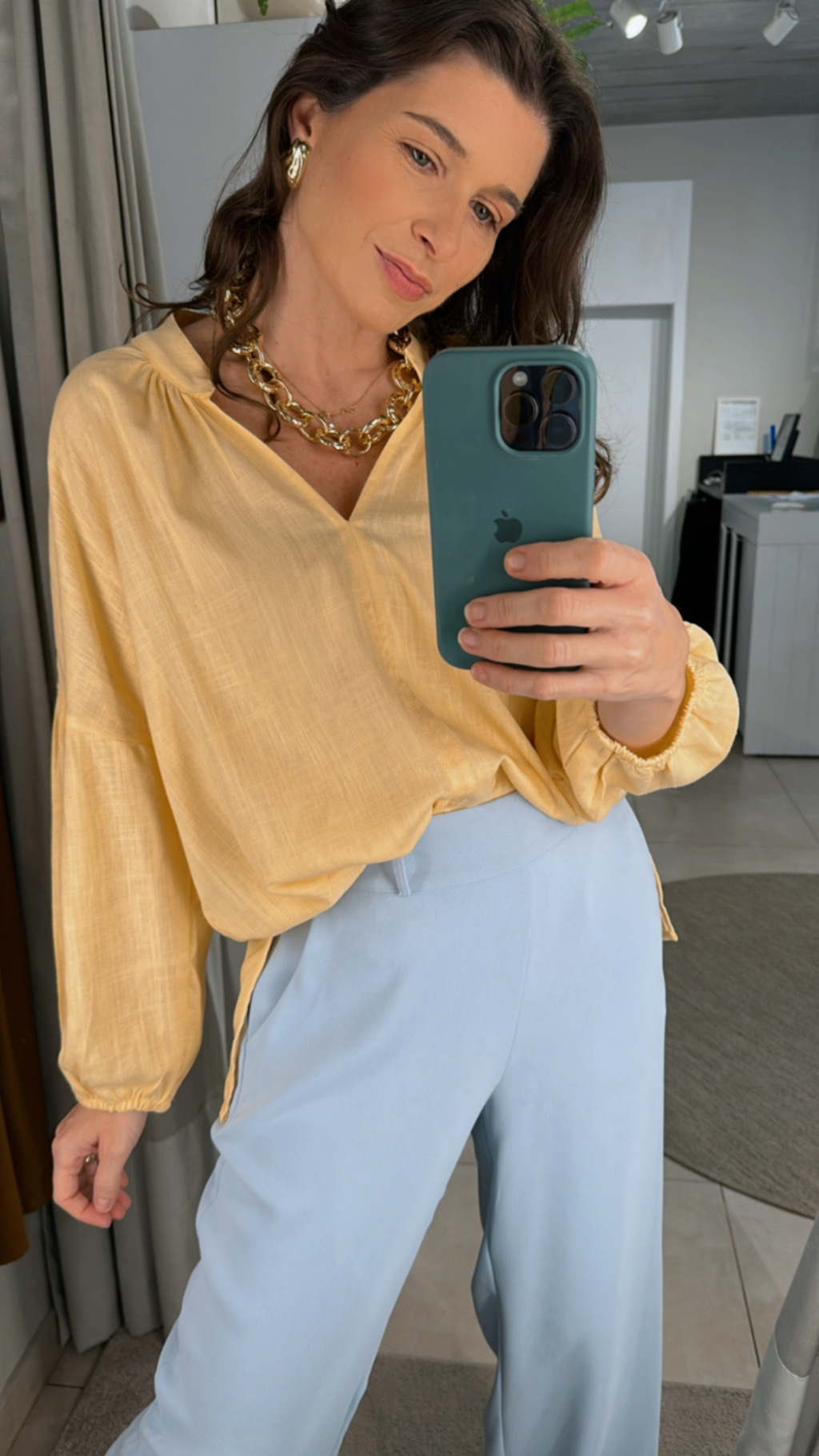 Confeccionada em tecido fluido, essa bata é versátil e fácil de combinar, ideal tanto para produções casuais quanto para ocasiões mais arrumadas.