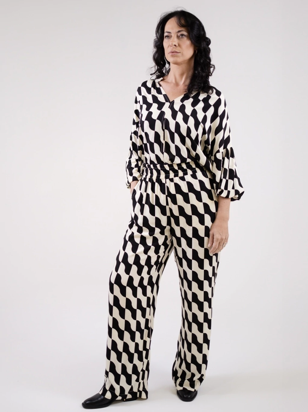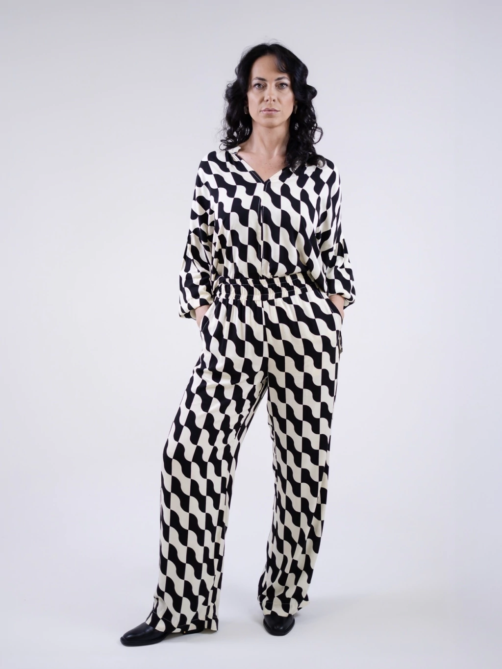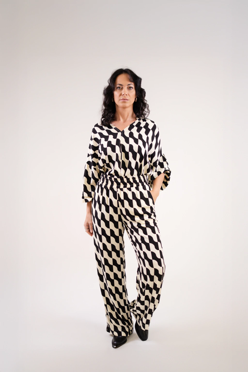 A calça tem modelagem pantalona, bem fluida, com um caimento leve e muito confortável. Feita em viscose, traz a mesma estampa geométrica em preto e off da blusa — uma proposta moderna, atemporal e sofisticada.