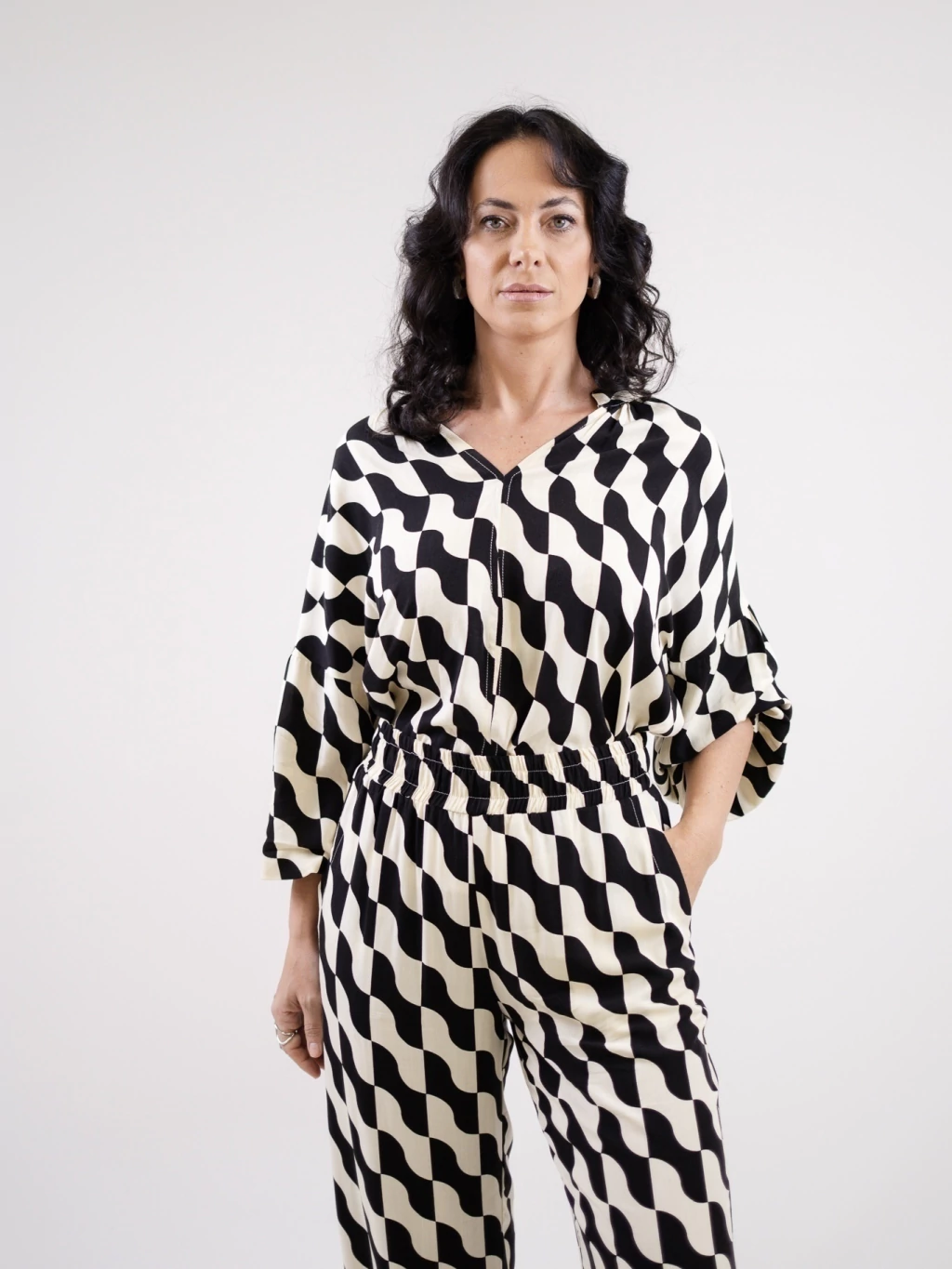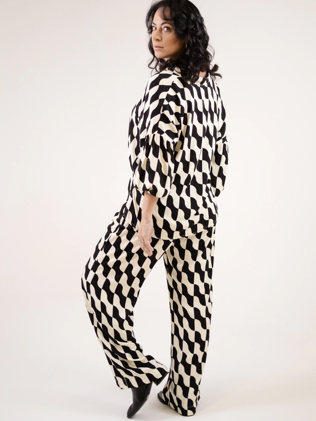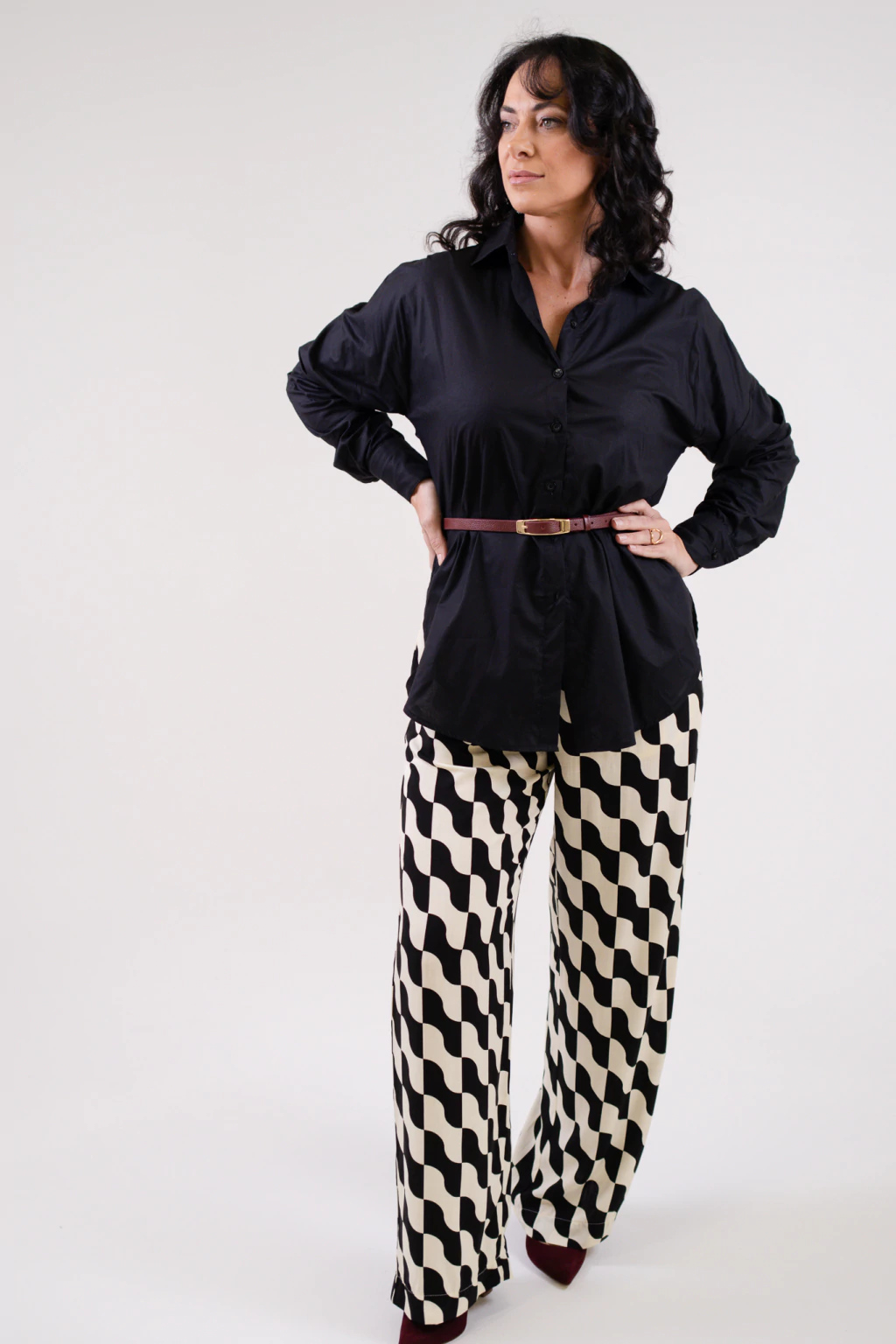 A calça tem modelagem pantalona, bem fluida, com um caimento leve e muito confortável. Feita em viscose, traz a mesma estampa geométrica em preto e off da blusa — uma proposta moderna, atemporal e sofisticada.